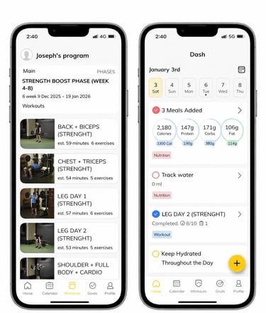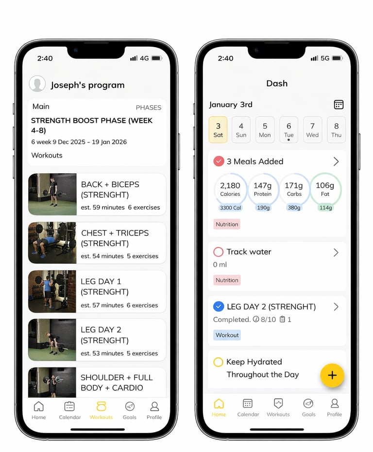 Your program is fully tailored to your goals. Inside the app, you’ll find your complete workout plan with step-by-step exercises and video demonstrations to ensure proper technique and confidence in every session.Nutrition guidance made simple